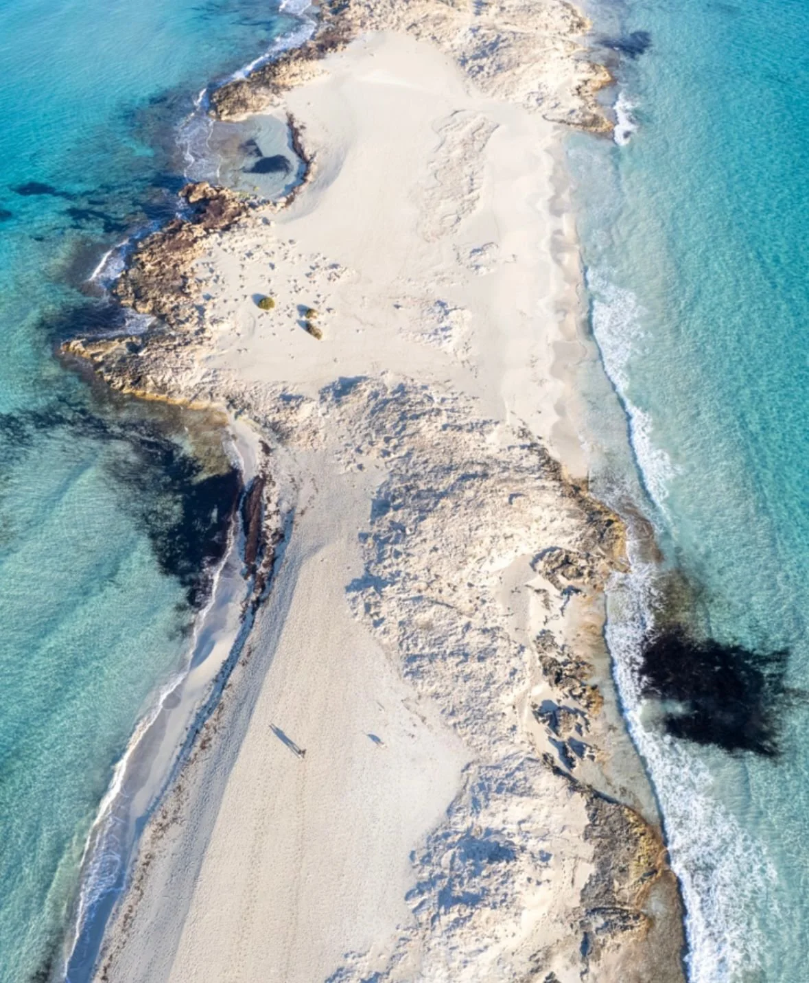Un luogo dove tutto rallenta, dove la semplicità diventa bellezza, dove l’essenziale prende il posto del superfluo. Il suo mood è naturale, libero, autentico. Formentera ha un’anima leggera e selvatica. È un’isola che invita a togliere, non ad aggiungere: le scarpe, i pensieri, le formalità. Il tempo scorre più lento. Ci si saluta con un sorriso. Si fa festa, sì — ma a piedi scalzi sulla sabbia o sotto le stelle, con la musica che esce da un chiringuito. È un’isola che non ostenta, non urla, non pretende.